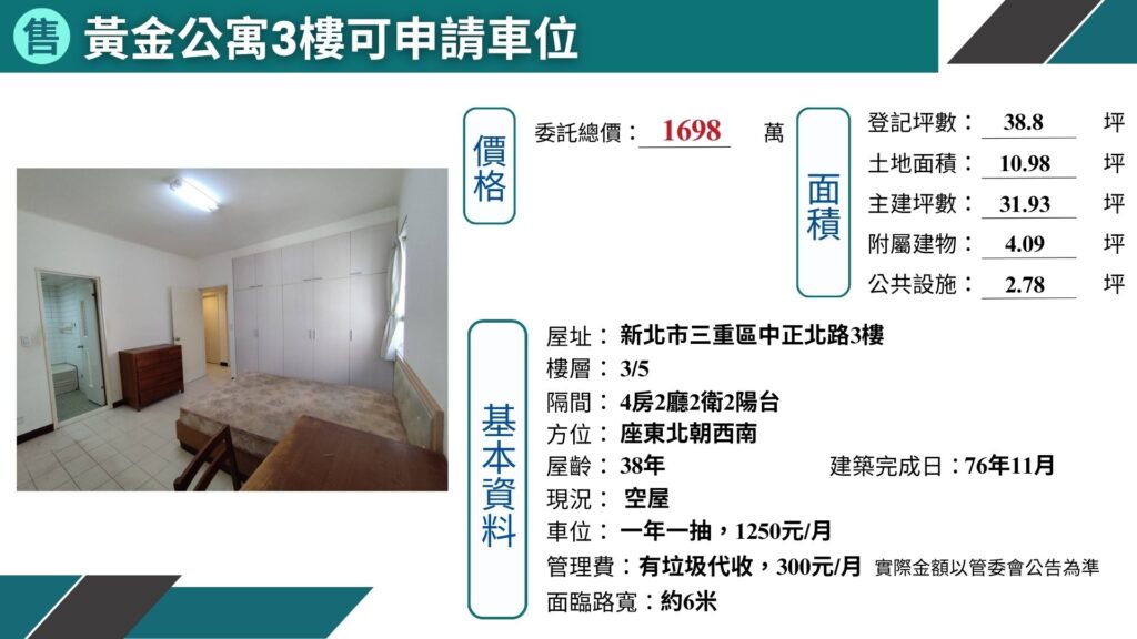 1️⃣ 實坪大於新成屋|4房2廳2衛2陽台、格局方正超好用